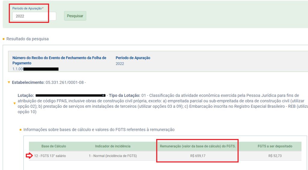 Para conferir no módulo web do eSocial, acessar o menu de totalizadores, selecionar empregador e a opção FGTS. A identificação da base FGTS 13o. final se dá informando o ano (2022 e não “13/2022”).
