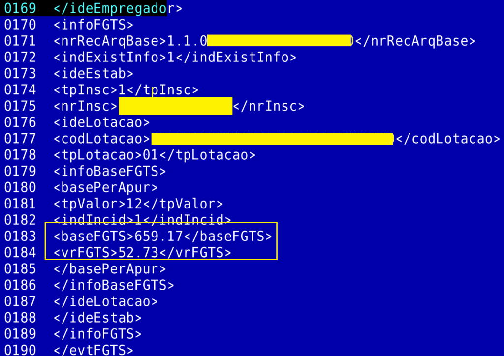 Em outra análise comparativa, 100% das bases de FGTS em concordância com as bases apuradas em folhas de pagamentos de matriz e filial, onde a apuração do eSocial (a partir do envio com sucesso dos eventos S-1200 e S-2299)a a aplicar separação por estabelecimento (S-1005) e lotação tributária (S-1020). Visto que na matriz a base foi apenas de tipo 11 (mensal) com batimento, a análise da filial foi mais interessante por conta dos tipos de bases 11, 21, 22 e 23 a envolver casos de rescisões com aviso prévio indenizado.